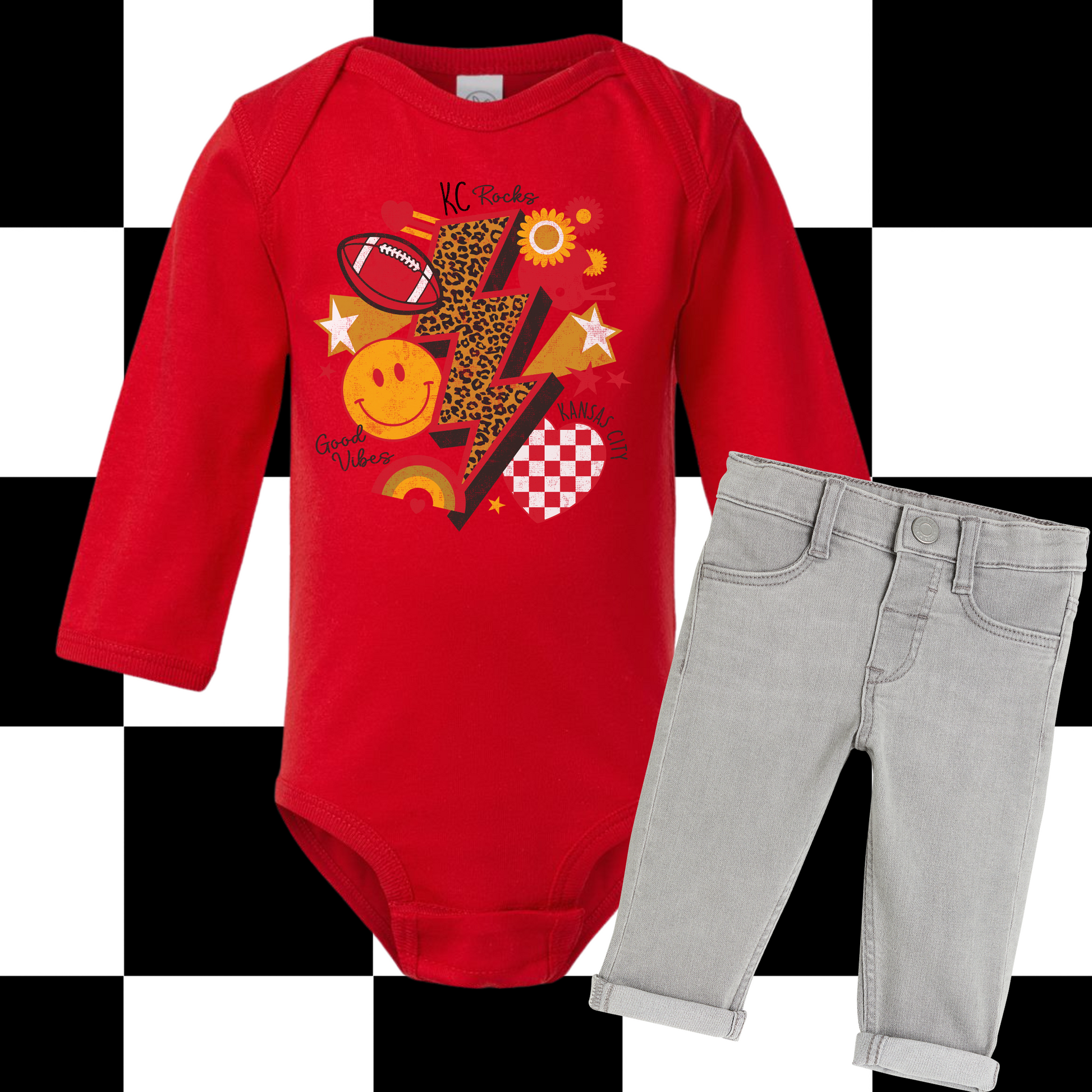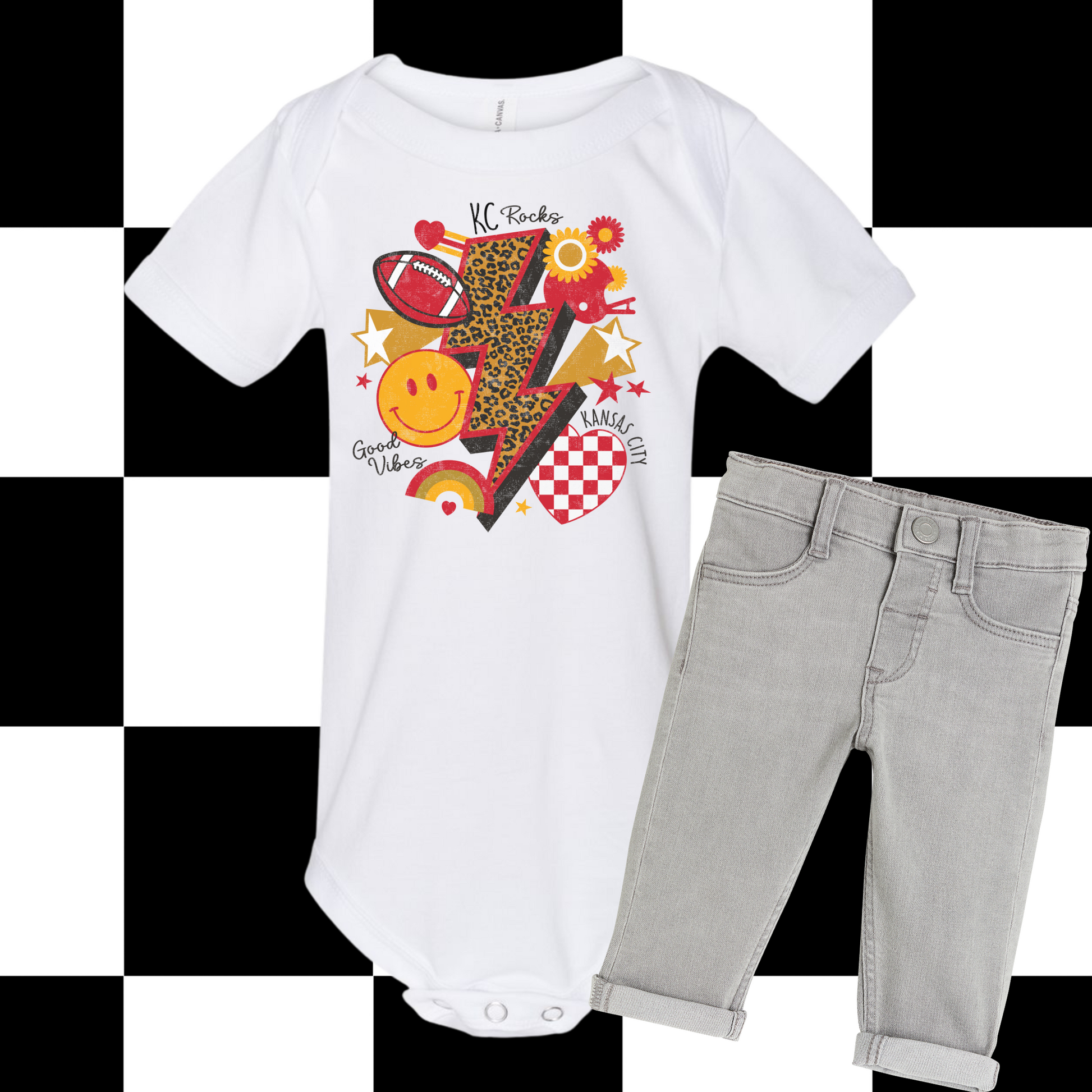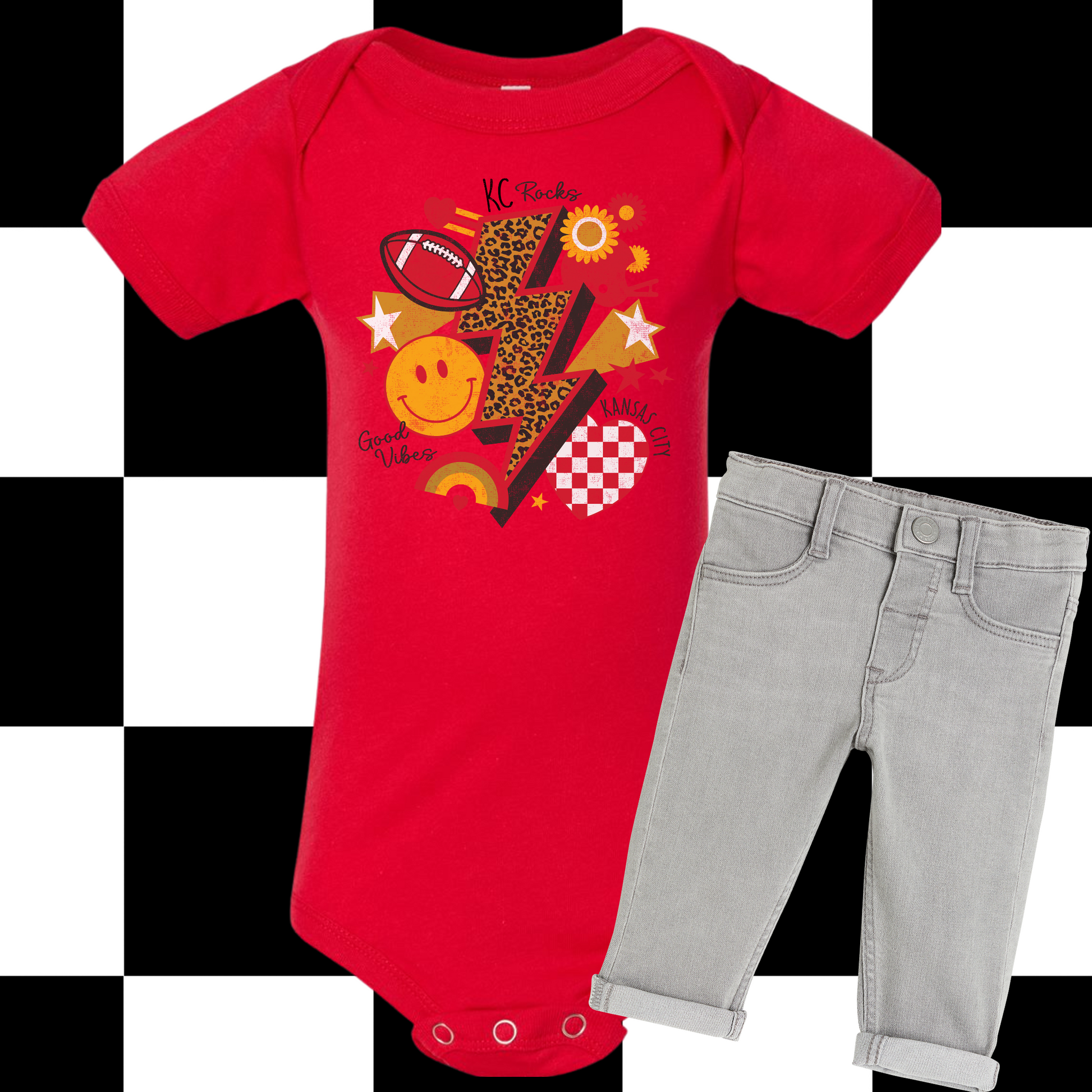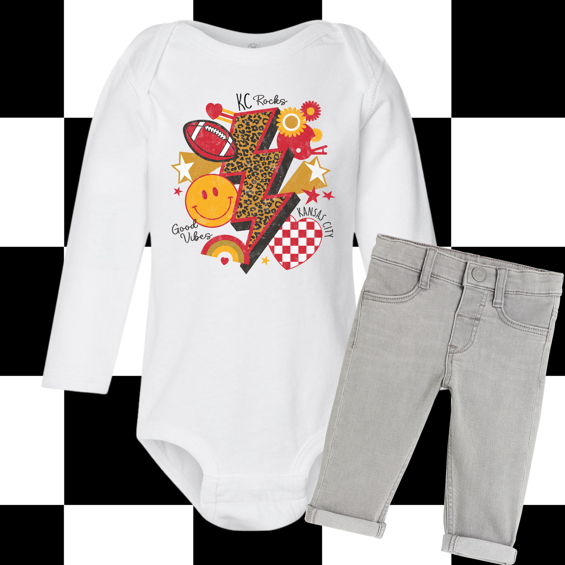 Bring retro vibes and KC pride together with this fun KC Rocks Good Vibes Shirt & Sweatshirt. Featuring a bold cheetah-print lightning bolt, football graphic, smiley face, stars, florals, rainbow, and a checkered KC heart, this playful design is all about Kansas City football and positive energy.