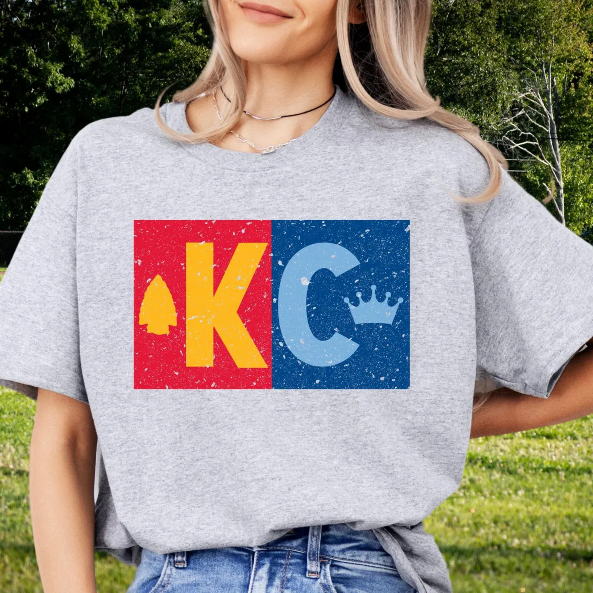 Show love for both sides of KC sports with the KC Dual Pride Tee. This bold split-design features a distressed red and gold arrowhead for football fans and a cool blue crown for baseball royalty—bringing Kansas City’s biggest teams together in one standout look. Printed on a soft heather grey tee, it’s the perfect way to represent all things KC.