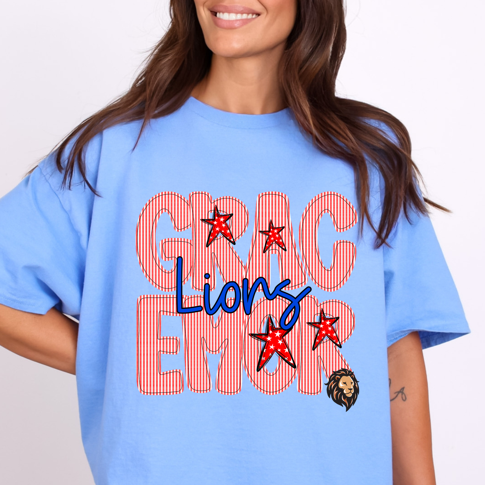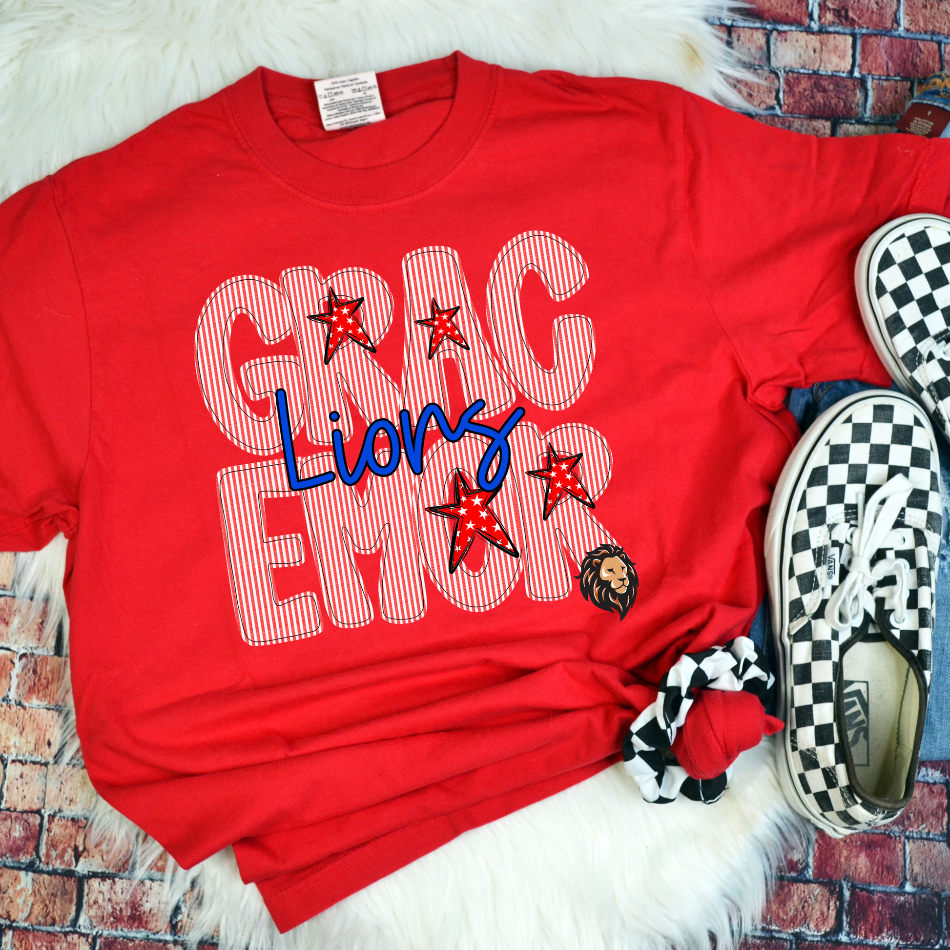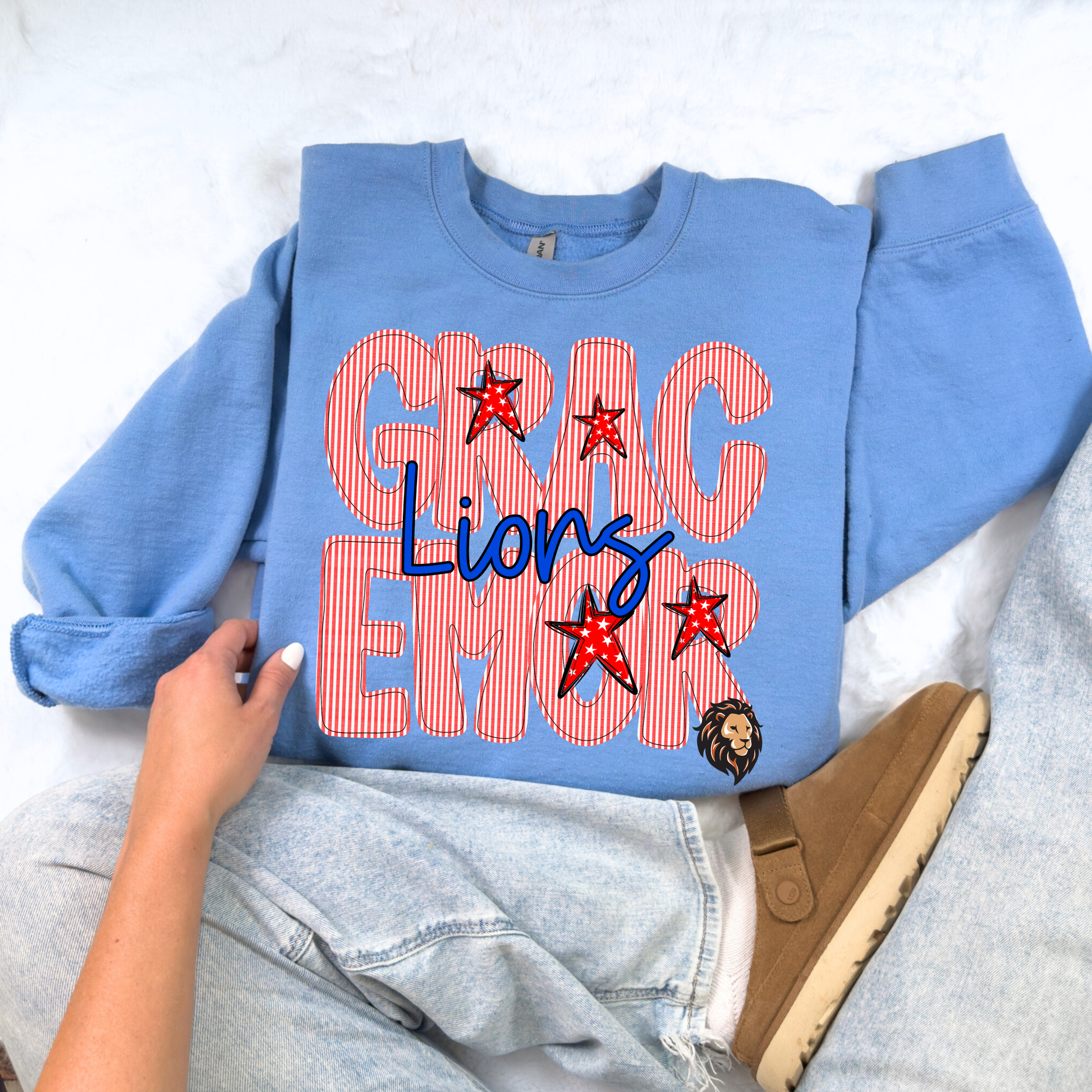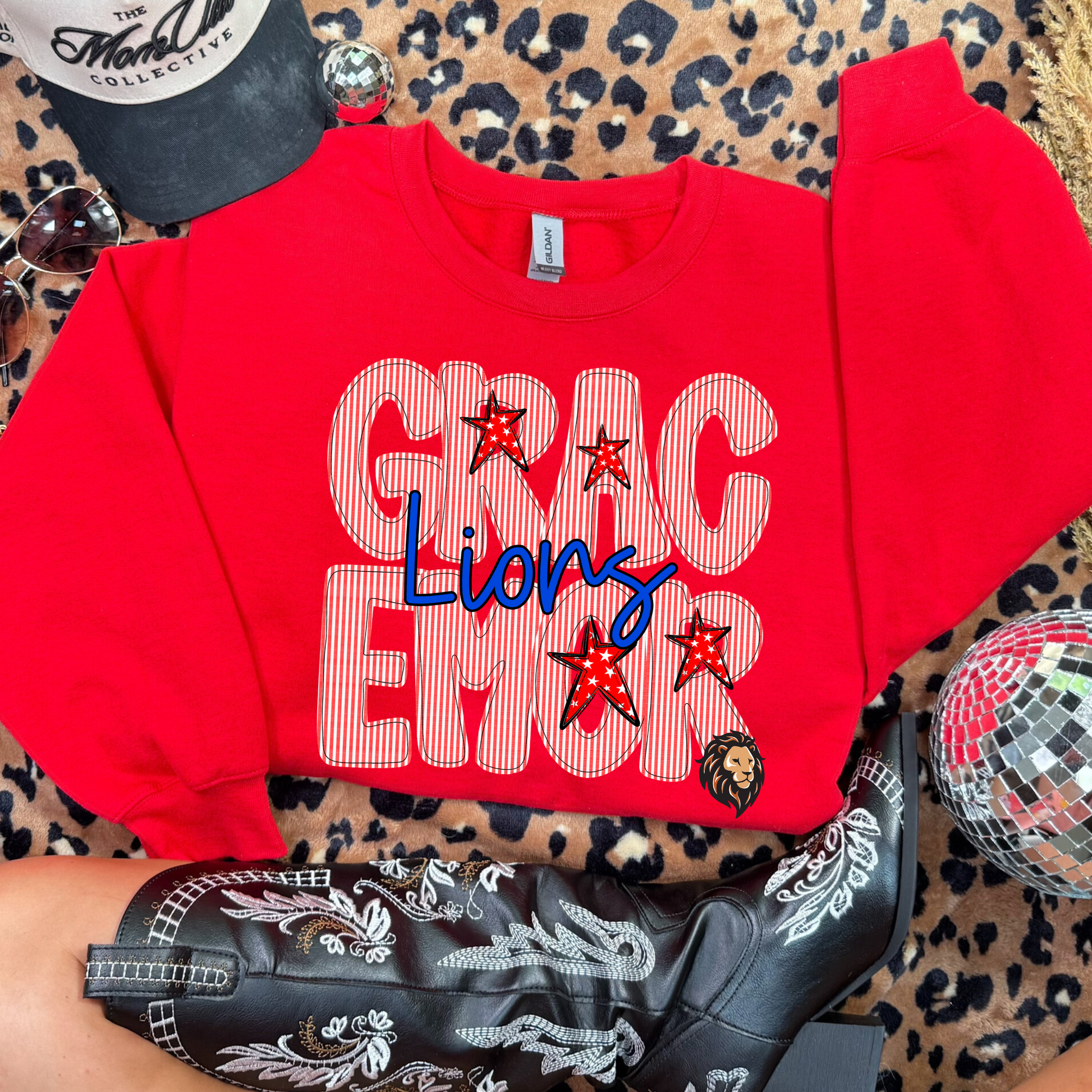 This fun and spirited youth sweatshirt features bold red-and-white pinstripe lettering, playful blue “Lions” script, and bright star accents—all finished with the Gracemor Lion mascot. It’s the perfect mix of comfort, school spirit, and standout style.
