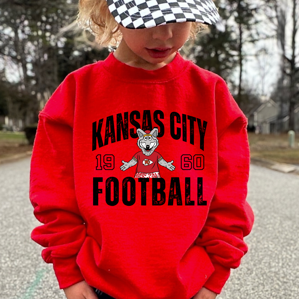 Keep your young fan cozy while repping their favorite team with this Kansas City Football Youth Sweatshirt! đ Featuring a bold âKansas City Footballâ graphic with the iconic KC wolf mascot and 1960 callout, this crewneck blends vintage football style with modern comfort.